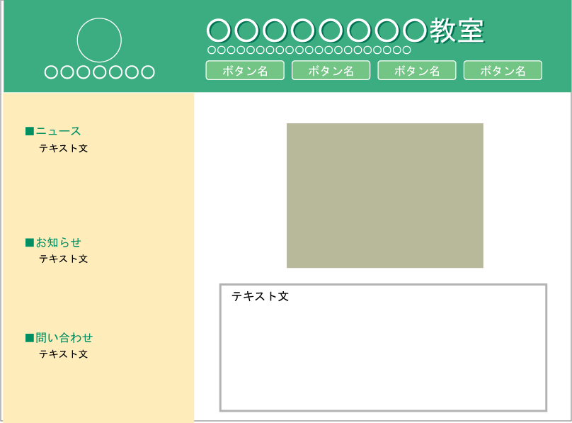 ホームページ作成ソフトの制限にとらわれない為にもホームページのイメージは初期段階ではイラストレーターなどで作ります。 下記のイメージのような物ならば、現時点の技量でも可能なはずです。技術を駆使して独自にデザインし作って下さい。 原稿としても使用できるように、最新の文章情報を反映させた内容にすること。